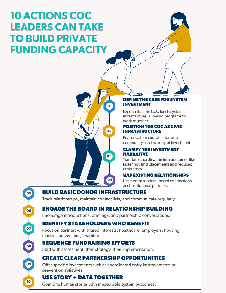 Without diversified funding sources, many CoCs struggle to invest in the coordination, strategy, and problem-solving capacity that ultimately improves system outcomes. Traditional nonprofit fundraising often focuses on individual service delivery. Donors are accustomed to supporting tangible outcomes such as meals served, beds provided, or individuals housed.
